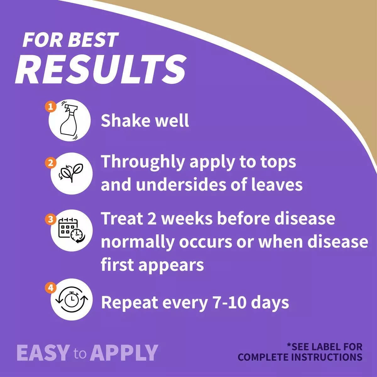 Controls powdery mildew, downy mildew, black spot, peach leaf curl, rust, and other listed diseases. Perfect for use on vegetables, roses, fruits, nuts, herbs, ornamentals, and turf. Incredibly easy to apply and can be used up to the day of harvest.