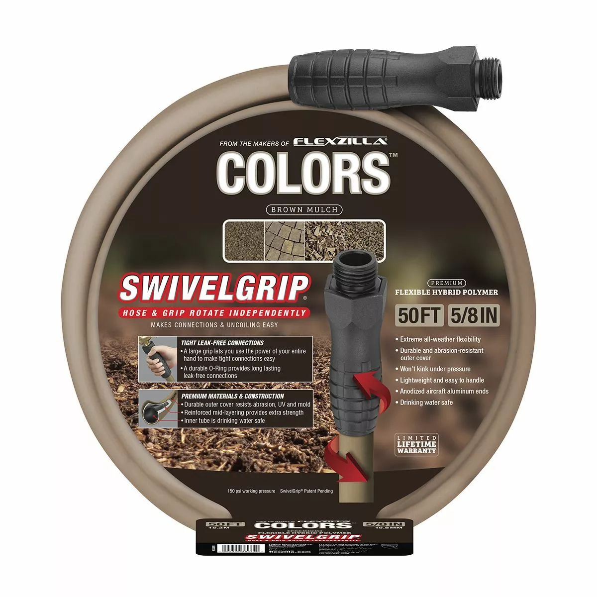 From the makers of Flexzilla, Colors Garden Hose makes it easier to work around your home and lawn. SwivelGrip action eliminates twists that occur when uncoiling a hose. Conventional garden hose can trap coils that tighten into kinks as you move across the yard. SwivelGrip allows the hose and grip to rotate independently, releasing coils naturally, easily and effortlessly. The large, comfortable gripping surface on both ends of the hose lets you use the power of your entire hand to make tight connections easy. Premium Colors Garden Hose features the same Flexible Hybrid Polymer material as our renowned ZillaGreen hoses, but comes in earthy colors ideal for a variety of landscapes.