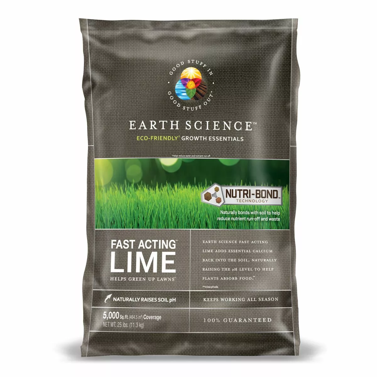 Earth Science Fast Acting Lime starts working immediately to naturally raise the pH level of your soil When pH is to low (less than 6.2 for most lawns), plants are unable to absorb nutrients from the soil. The result is weak, thin grass with bare spots and weeds. When used as directed, Earth Science Fast Acting Lime helps plants absorb food and improves fertilizer effectiveness, for a thicker, greener lawn. 25lbs covers up to 5,000 sq. ft.