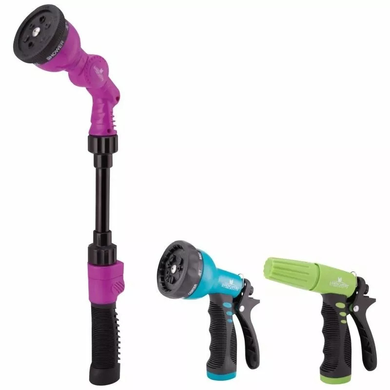 - 9-pattern spray nozzle: Soft dial turret guard, a locking clip which allows continuous water flow and a control switch to regulate water flow