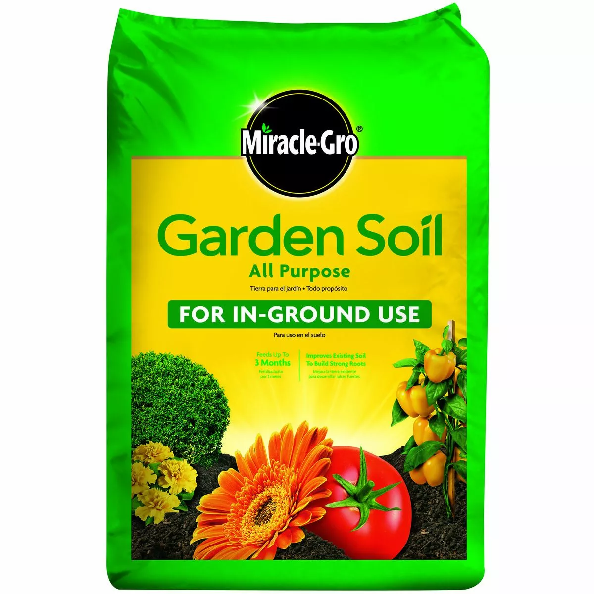 Miracle-Gro Garden Soil All Purpose delivers bigger, more beautiful plants, vegetables, fruits and flowers (versus unfed plants)—because when it comes to your garden, only the best will do. From front-yard landscaping to backyard gardens, this complete in-ground soil is perfect for all your outdoor, in-ground gardening needs. The soil is fortified with continuous release plant food and feeds for up to 3 months so your plants have the foundation they need to thrive. It also improves existing flower bed soil and builds strong roots so your annuals and perennials flourish below ground as much as they do above. For more spectacular results, start a regular feeding regimen with Miracle-Gro plant food 30 days after planting. Plus, with each bag of soil, you’re partnering with us in one of the world’s largest recycling efforts. As part of our commitment to sustainability, each year we beneficially reuse billions of pounds of material from yards, farms and forests to help you grow plants that enhance your environment and make the world more beautiful.