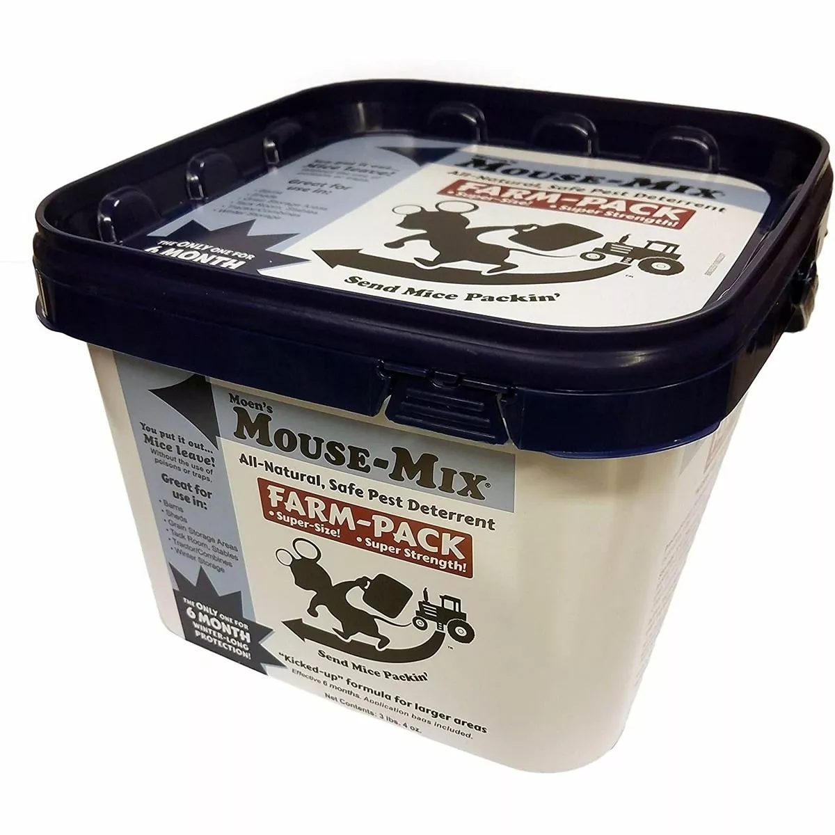 The Moen’s Mouse-Mix Farm Pack’s larger size is super strong, being kicked up with nearly twice the spices in the secret recipe. This product is meant for the treatment of large buildings and outdoor storage areas like barns, sheds, hunting shacks, grain storage areas, pole barns, tractors, combines, and more! The Moen’s Mouse-Mix Farm Pack comes in a large bucket container that holds nearly one gallon of the more powerful product. This product is exceptional for the winter storage of tractors, combines, and other farm implements in preventing mice and rats from chewing on expensive wiring and upholstery of the machines.