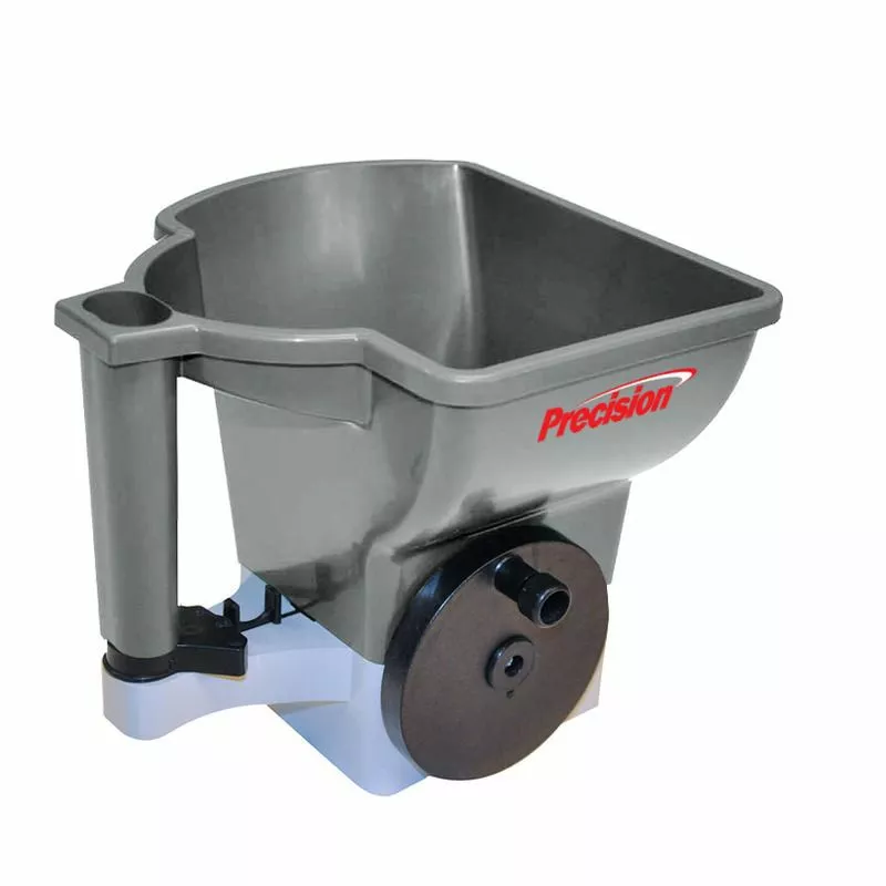 Scoop for easy filling, ideal for small lawns, hills, uneven ground, and wet terrain, adjustable flow rate, 6 FT – 12 FT spread pattern. Heavy duty plastic gears.