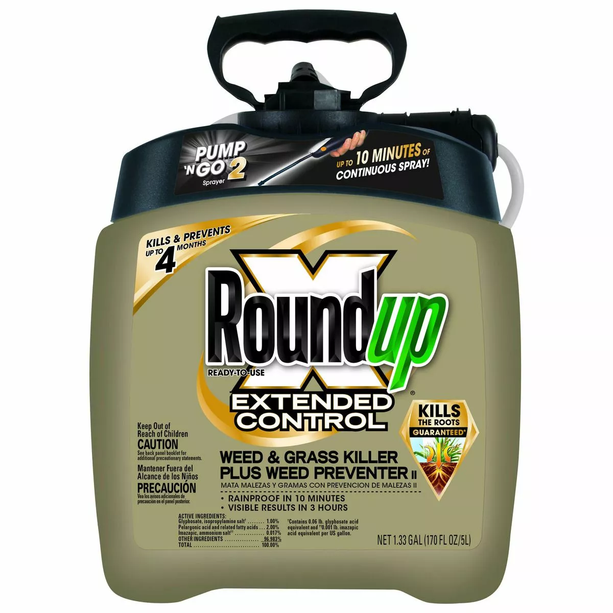 The dual-action formula of Roundup Ready-To-Use Extended Control Weed & Grass Killer Plus Weed Preventer II kills existing weeds down to the root and prevents new ones from growing for up to 4 months, guaranteed! Plus, the Roundup Extended Control can be used on driveways, sidewalks and patios; along fences, foundations, curbs retaining walls and edge of lawns, as well as on decorative rock or gravel areas. Rainproof in 10 minutes with visible results in 3 hours. Roundup works. Fast.