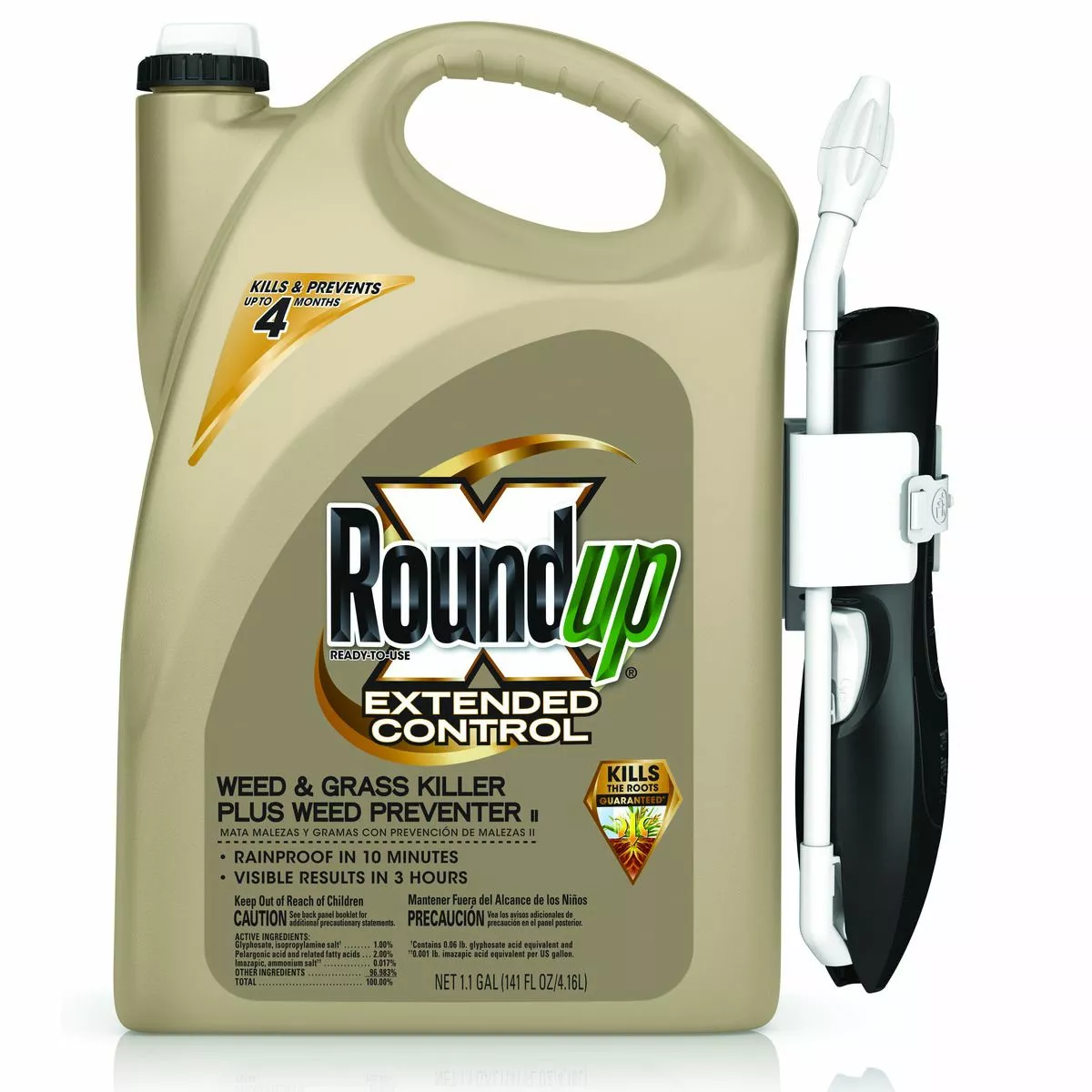 The dual-action formula of Roundup Ready-To-Use Extended Control Weed & Grass Killer Plus Weed Preventer II kills existing weeds down to the root and prevents new ones from growing for up to 4 months, guaranteed! Plus, the Roundup Extended Control can be used on driveways, sidewalks and patios; along fences, foundations, curbs retaining walls and edge of lawns, as well as on decorative rock or gravel areas. Rainproof in 10 minutes with visible results in 3 hours. Roundup works. Fast