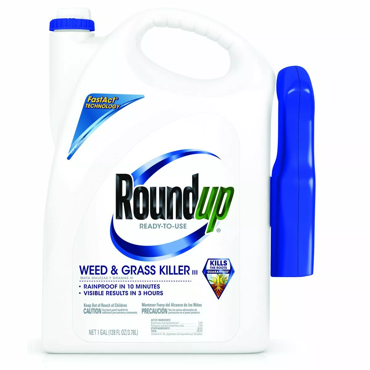 Kill the toughest weeds and grasses down to the root with Roundup Ready-To-Use Weed & Grass Killer III! The formula is ideal for use in and around vegetable gardens, flower beds, tree rings and mulched beds, as well as on cracks in driveways, walkways and patios. This convenient, no-mix formula is rainproof in just 10 minutes—AND you get visible results in 3 hours. Kill weeds faster with Roundup