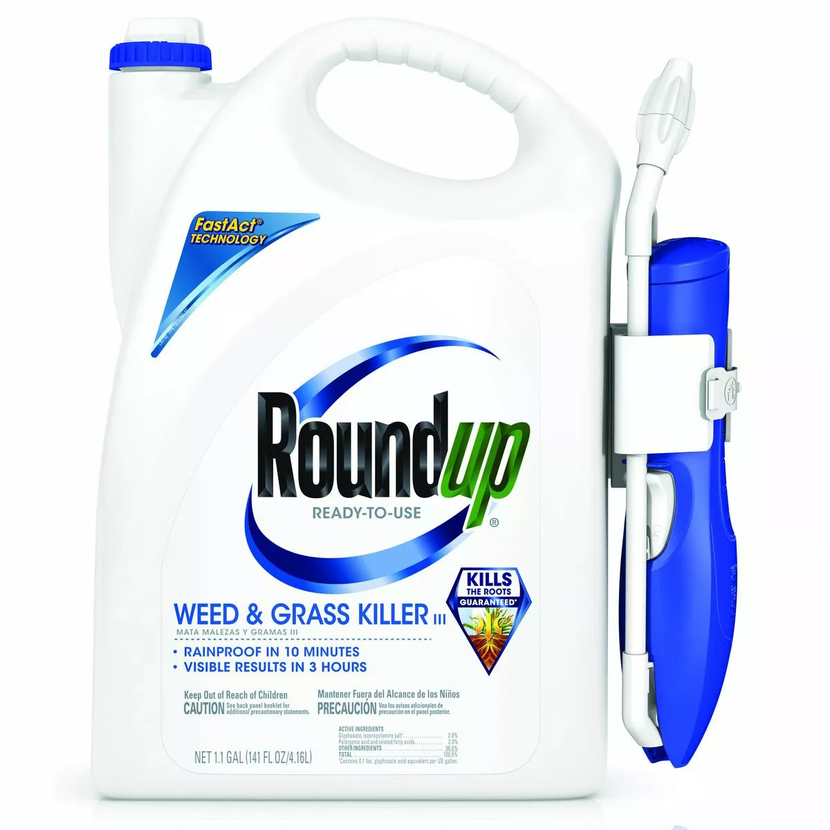 Kill the toughest weeds and grasses down to the root with Roundup Ready-To-Use Weed & Grass Killer III! The formula is ideal for use in and around vegetable gardens, flower beds, tree rings and mulched beds, as well as on cracks in driveways, walkways and patios. This convenient, no-mix formula is rainproof in just 10 minutes—AND you get visible results in 3 hours. Kill weeds faster with Roundup