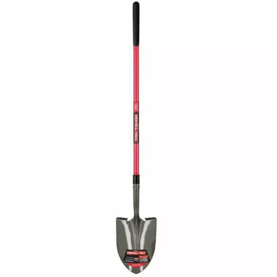 Tru Tough Round Point Shovel, Ergonomic Triangular Fiberglass Handle, 9-Inch Grip, 47-Inch. 47-inch Ergonomic triangular fiberglass handle is ergonomically shaped or less fatigue, longer use. 9-inch Cushion grip for improved control and reduced hand fatigue. Sturdy steel collar reinforces head to handle assembly. A seriously long lasting tool at an affordable price.