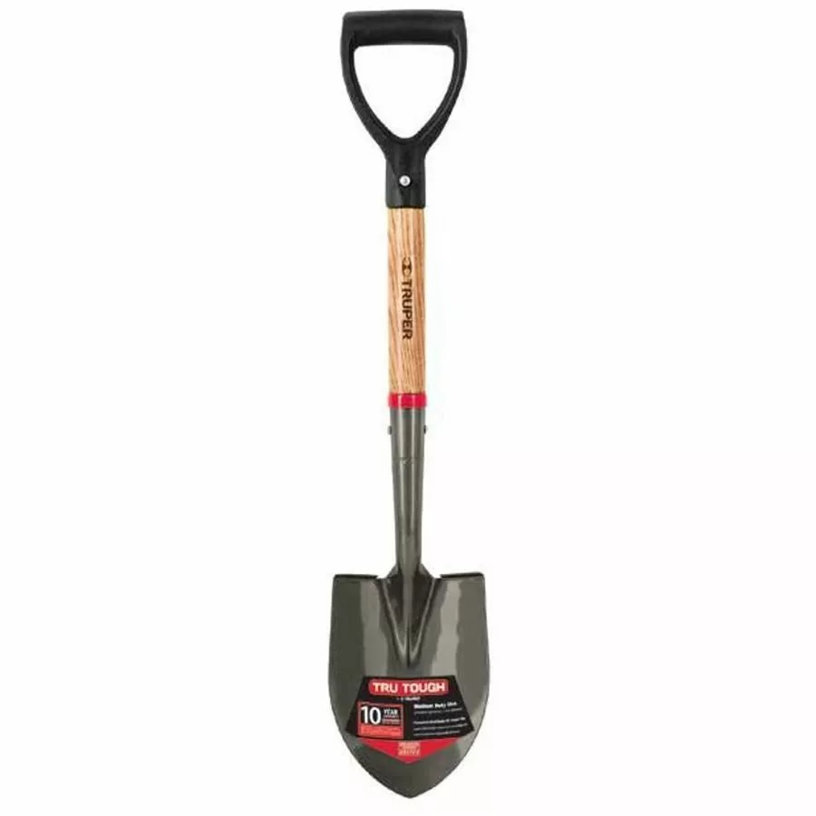 Tru Tough Short D-Handle Round Point Shovel, 19-Inch Wood, 19-Inch. 19-inch North American Ash, lacquered handle for strength and durability. White Ash handles give optimum ratio of resistance and flexibility. 9-inch Cushion grip for improved control and reduced hand fatigue. Sturdy steel collar reinforces head to handle assembly.