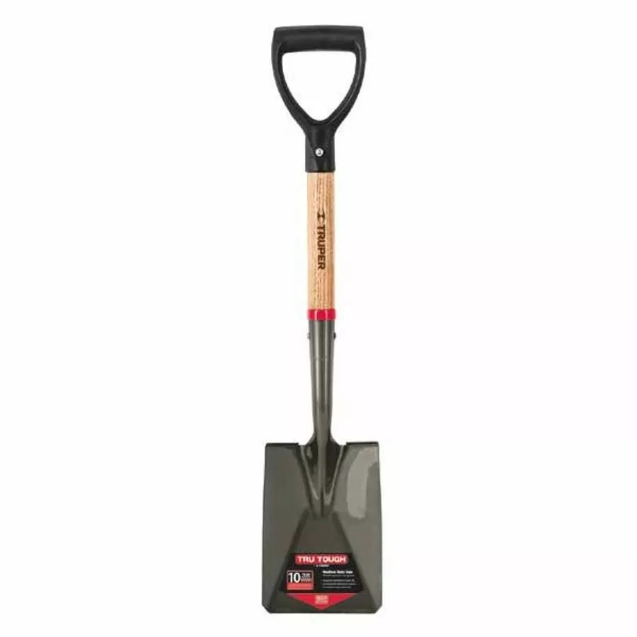 Tru Tough Short D-Handle Square Point Shovel, 19-Inch Wood, 19-Inch. 19-inch North American Ash, lacquered handle for strength and durability. White Ash handles give optimum ratio of resistance and flexibility. 9-inch Cushion grip for improved control and reduced hand fatigue. Sturdy steel collar reinforces head to handle assembly.