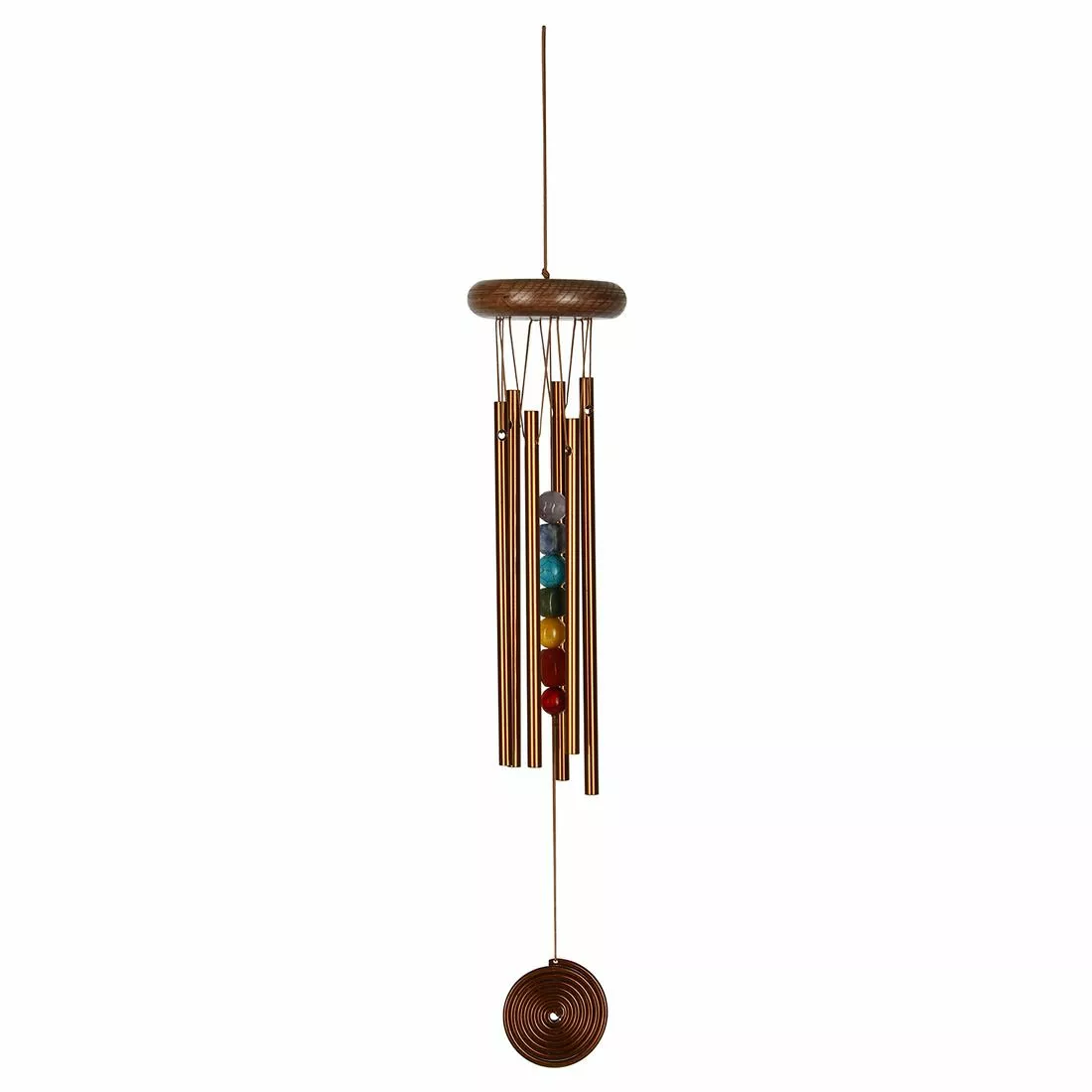This chime’s clapper has seven stones, one for each of the seven chakras. The seven stones of this wind chime’s clapper are aligned in an ascending column, just as the seven chakras are aligned along the spine in the human body. Woodstock Chakra Chimes combine color and sound to underscore the ancient meaning of the major energy centers of the human body. Eastern philosophy can be difficult for the Western scientific mind to assimilate, and yet many of the Eastern claims are being proven scientifically as the time honored truths that they are. According to the traditions, there are seven basic chakras, which correlate to the seven main nerve ganglia emanating from the spinal column, as revealed through modern studies of physiology. Each chakra location has a unique meaning, orientation and healing potential. Woodstock Chakra Chimes are intended to remind us of the strength of mind over matter and, through sound, give us a small window into the balance of the physical and metaphysical. The seven chakras are: Sahasrara: The Crown Chakra. Its color is violet, and it is related to thought and self knowledge. It is represented by amethyst. Ajna: The Brow Chakra. Its color is indigo, and it is related to intuition and clarity. It is represented by lapis. Vishuddha: The Throat Chakra. Its color it turquoise, and it is related to sound and self expression. It is represented by turquoise. Anahata: The Heart Chakra. Its color is green, and it is related to love and compassion. It is represented by aventurine. Manipura: The Solar Plexus Chakra. Its color is yellow, and it is related to growth and personal power. It is represented by citrine. Svadhisthana The Sacral Chakra. Its color is orange, and it is related to creativity and enthusiasm. It is represented by carnelian. Muladhara: The Base Chakra. Its color is red, and it is related to physical identity and self preservation. It is represented by red jasper.